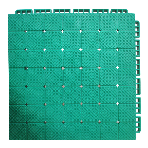 1、 室外運(yùn)動地板表面為菱形落空面,耐沖擊性聚丙烯,懸浮式共聚物模塊,有907個支撐腳。